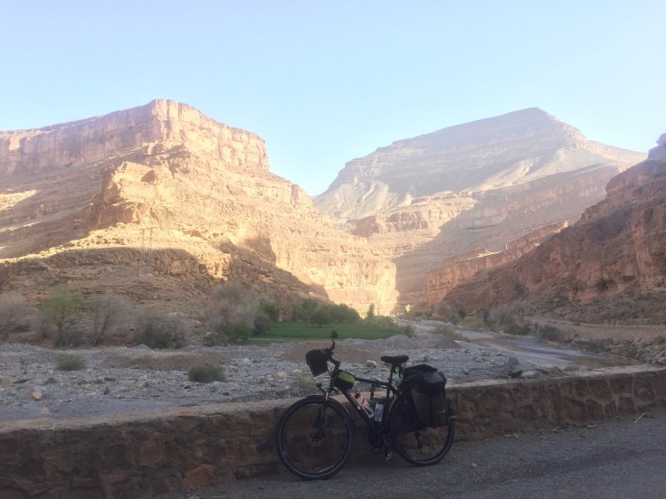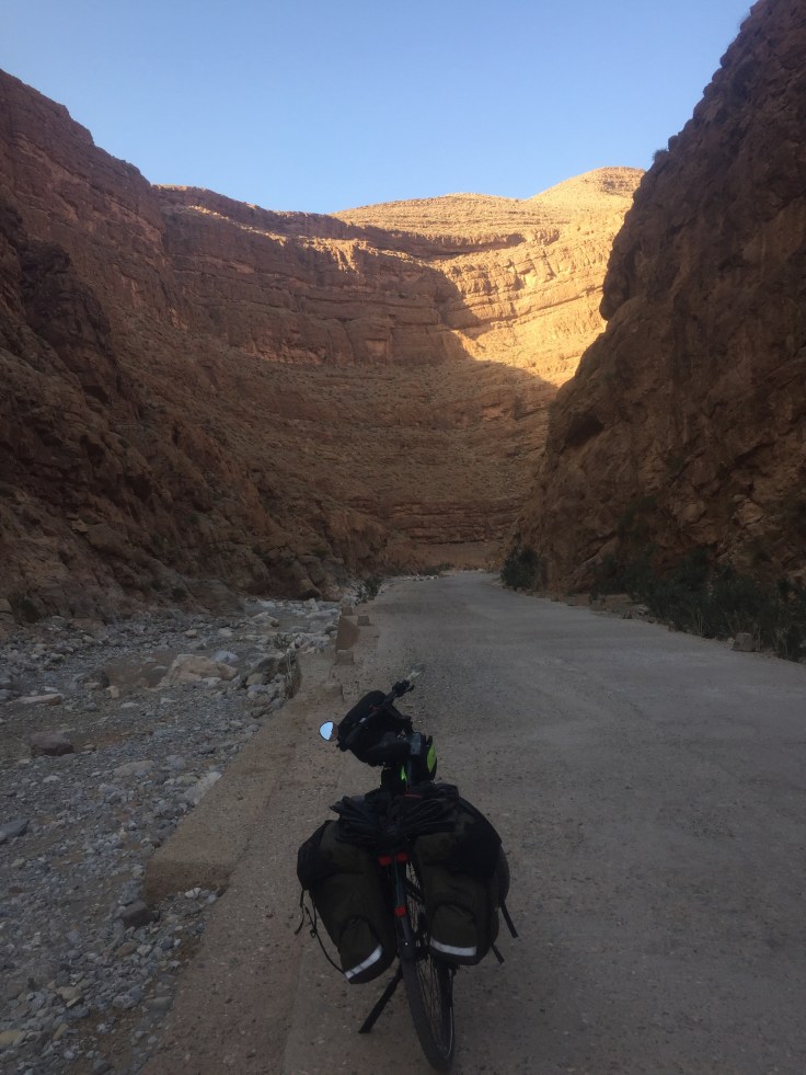 An early start takes me through the Gorge. I stop all the time to take pictures. Once I pass the gorge, the landscape turns much drier and now it looks like pre-desert again. I meet some kids, Moha, Said and 2 others, that are cycling back from school. They are 14 years old. Some of their bikes are really old and broken. Most cannot shift gears. They do 25 km everyday back and forth to school. And it’s not precisely flat. They are sooo strong.