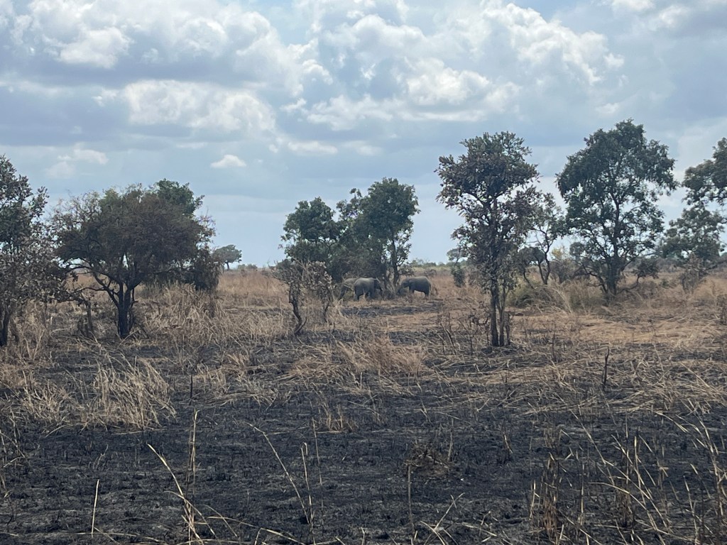 After 5 km, we enter the National Park, which as mentioned is crossed by a proper national road, with a lot of trucks. A big banner saying “Danger, wild animals” welcomes you. On top of that, all the land around the road is burnt, we wonder why. But the park is of a proper size, with a lot of deviations to high-end lodges.