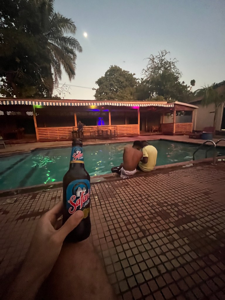 We make it to the hotel, which is incredibly clean. The swimming pool area is really nice and food and beers are just a bit more expensive than on the road. Great. For EUR 22 both, breakfast included, it’s a pretty good deal. What is not so great is the ambience. It’s full of rich locals that are far from friendly. They look suspiciously to us. Some laugh among them looking at us. We seem to be the only wazungu 50 km around. The clients dress rapper-like clothes and don’t take their eyes out from their phones. They take selfies constantly, and they have parked huge pick-ups on the entrance. A guy is learning to swim in the pool, while he constantly stares at us. So random.