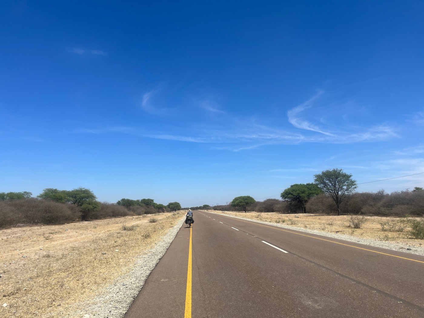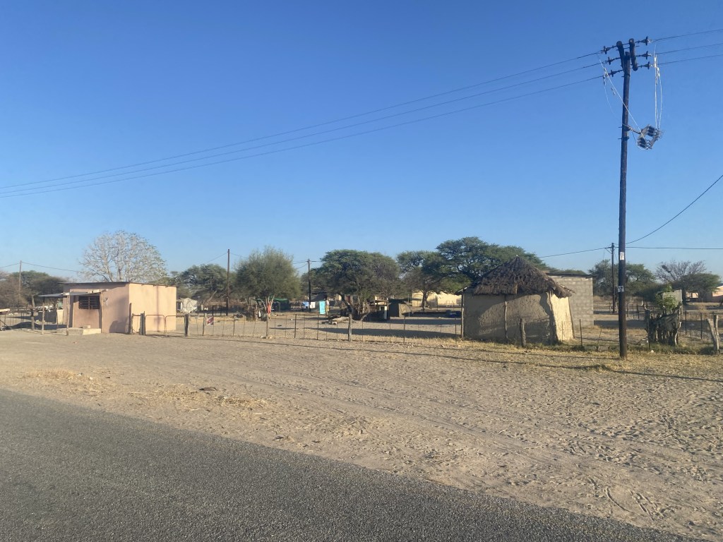 So we kick off the cycling, and soon we are out of Maun. The landscape remains the same as before: bushy, flat and dry, but the difference is that, instead of wild animals, we mostly see cattle on the sides of the roads. We will learn that Tswanan families typically have 4-5 cows and some dozens of goats, and they let them roam around their villages. We however struggle to pass through villages, so we pressume they are in the inside. Somehow not being on high alert due to elephants make the day less interesting. Despite the beginning of the rain season, not a single drop has fallen in Botswana and the 38 degrees without clouds force us to finish our day by lunch time to survive.